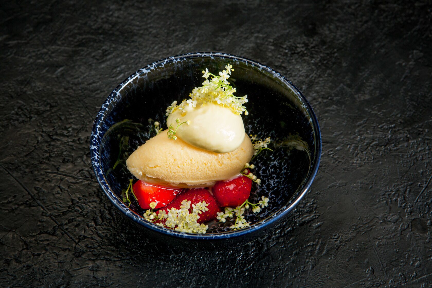 По идее это должна была быть игра в Юг и Север, в итоге шефы пошли более универсальным, но куда более неожиданным путем, всю дорогу меняясь "местами". То "южный" Любимов устраивал на тарелке чистый беспримесный нордик, сочетая приготовленную спаржу с еловыми иголками младенческой свежести а-ля натюрель, то "северный" Гришечкин темпераментно отдавал спелой сладкой клубнике роль хрена в окрошке.